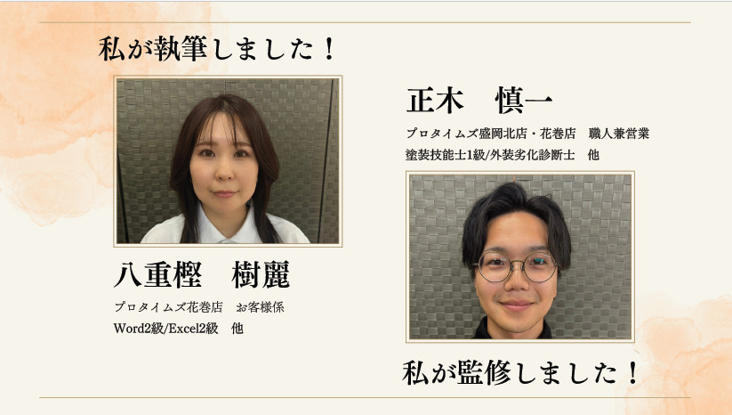 この記事はプロタイムズ花巻店お客様係の八重樫樹麗が執筆し、塗装技能士一級の正木慎一が監修しました。