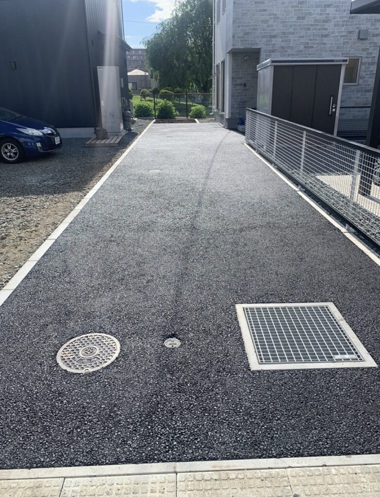 💬駐車場までの通路も舗装させていただきました。アスファルト舗装したことにより雪かきも楽になりました。透水性のアスファルトのため、水たまりもできず快適です🎵