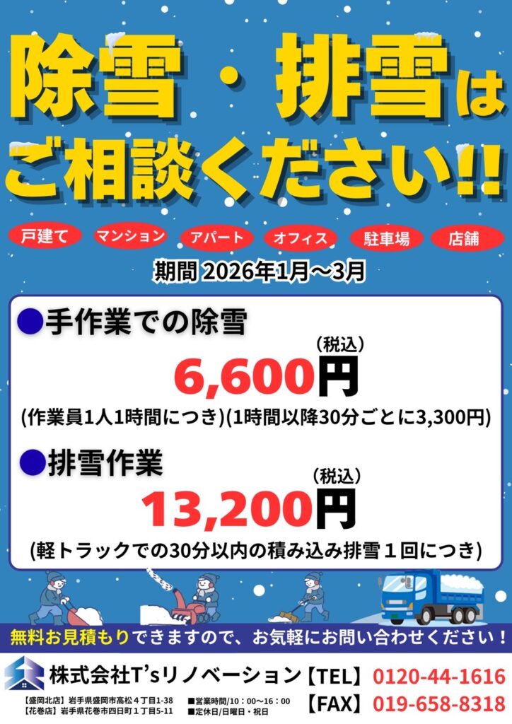 外壁塗装・屋根塗装・外装修理・屋根外壁カバー工法・給湯器交換(エコキュート)・お家の水回り・トイレ・ユニットバス・洗面化粧台・火災保険対応・雨樋修理・雪止め・駐車場・カーポート・フェンス・ウッドデッキ・外壁洗浄サービスで何かお困りごとがございましたら株式会社T’sリノベーション(プロタイムズ盛岡北店・花巻店)にお任せください!