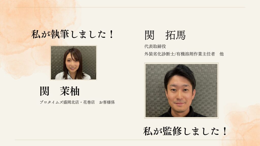 外装劣化診断士/有機溶剤作業主任者 他の資格を持つ 代表取締役社長 関 拓馬 が監修致しました。