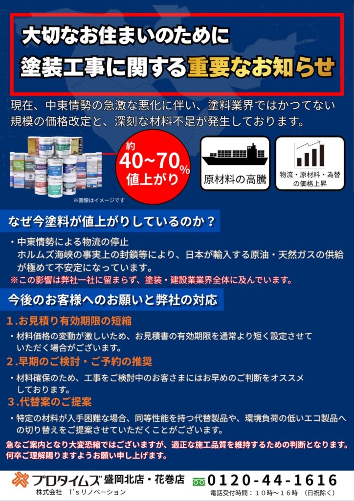 【重要】中東情勢の影響で塗料不足、材料価格高騰!盛岡市・花巻市で外壁塗装をご検討中の方へ重要なお知らせ‼️※ぜひご覧くださいませ🙇🏻
